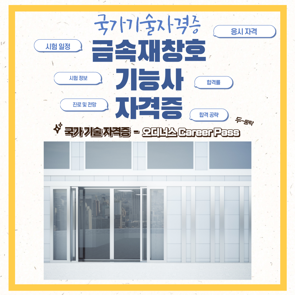 오늘날 금속재 창호의 사용의 빈도수가 높아지고 있어 건물의 사용목적, 실내 및 외부와의 연관성에 따라 금속재 창호의 사용 재질, 크기, 형태, 위치 및 개수를 파악하여 제작하고 시공할 수 있는 인력을 양성하기 위해 만든 자격입니다. 금속재창호기능사는 각종 금속재 창호를 효율적으로 제작하고 건축물에 설치하는 출입문, 창문 등을 제작하고 시공 및 보수하는 작업이 주 업무입니다.