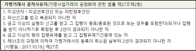 ※ 다만, 가맹거래사 등록신청일 기준으로「가맹사업거래의 공정화에 관한 법률」 제27조 제2항에서 정한