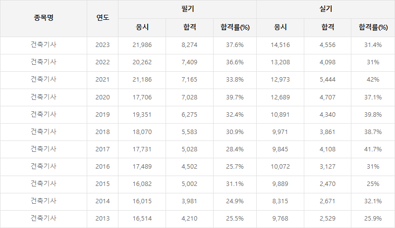 필기시험은 문제은행식이라 대체로 출제 경향이 나와 있지만 범위가 굉장히 넓어 암기가 굉장히 중요합니다. 건축과 전공자들도 필기시험 합격률이 30%인 것을 생각해 본다면 난이도가 꽤 있는 자격이라고 볼 수 있습니다. 문제의 난이도 역시 타 기사시험과 비교했을 때 높은 편이고 출제 범위 또한 굉장히 광범위한 편이라 많은 노력을 요구합니다. 실기시험의 경우 건축시공, 공정관리, 건축적산, 건축구조 총 4과목으로 이루어져 있으며 실기시험은 필답형으로 진행되며 기출문제를 많이 풀어보는 것이 중요합니다. 보통 70% 정도 기출문제에서 출제되며 30% 정도 신유형이 출제되므로 10년 치 기출문제를 반복해서 풀어본다면 합격하는 데 도움이 될 것입니다.