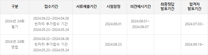 | 제 2차 시험 | * 1차시험 과목 전반 | * 면접 형식 | * 100점을 만점으로 60점 이상 |