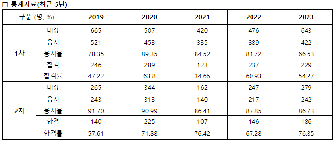 검수사 2차 시험의 경우, 1차 필기시험에서 다뤘던 내용을 다시 한번 면접으로 확인하는 형식이기 때문에, 1차 필기시험 시 공부했던 내용을 정말 '모조리' 외워야 합니다. 또한, 1차 필기시험 시에 평가했던 내용을 기반으로, 자신만의 답변을 만드는 것도 좋은 방법입니다. 또한, 인터넷 블로그 및 유튜브에도 검수사 면접시험에 관한 정보가 있으니, 해당 정보를 참고하는 것도 많은 도움이 됩니다. 참고로, 많은 응시생 및 합격자들의 조언은, 검수사 시험은 학원을 다니거나 많은 비용을 들여 공부할만한 내용은 아니라는 것입니다. 시중에 나와있는 참고서 및 인터넷 정보를 참고하면 충분히 합격할 수 있습니다. 합격률 또한 최소 55%에서 최대 85%까지로, 상당히 높은 것을 확인할 수 있습니다.
