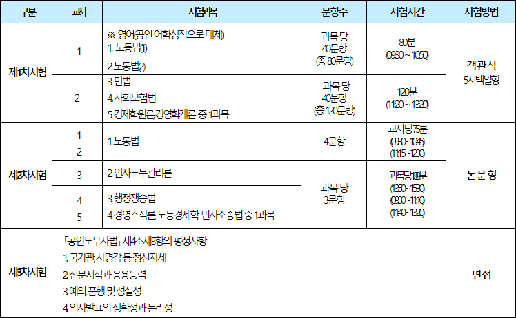 노동법 과목은 유일하게 2교시에 걸쳐 시험이 이루어진다. 노동법 (1)과 (2)가 통합되어 문제가 출제되고, 다른 과목보다 1.5배 높은 150점의 배점이 할당되어 있습니다