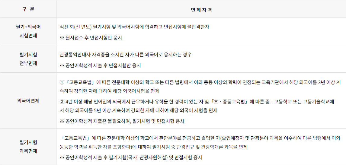 관광통역안내사 - 정보, 응시 자격, 시험 일정, 시험 내용, 면제 대상, 공인어학성적 기준, 합격률, 합격 공략, 기출 문제, 진로 및 전망