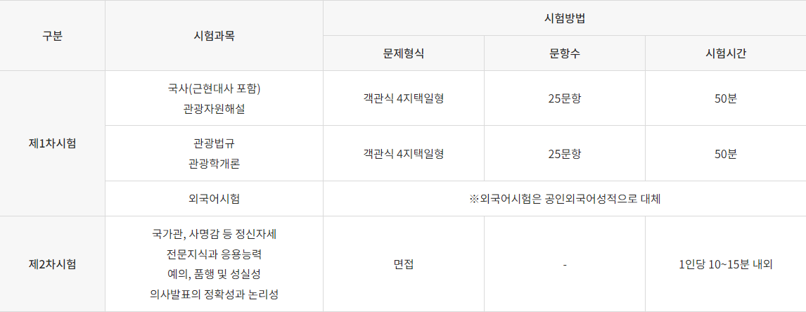 관광학개론 과목은 관광법규와 중복되는 부분이 있으므로, 서로 관련 지어 공부해야 하며 혼동되지 않도록 유의해야 합니다. 외국어 과목은 각 외국어의 공인 어학 시험으로 대체가 됩니다.