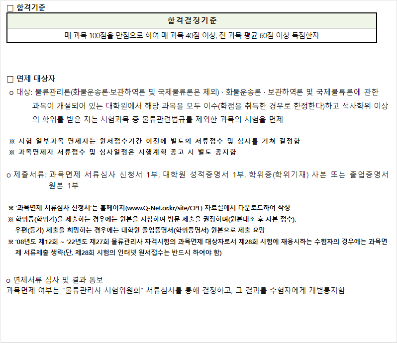 물류관리사 시험 과목 및 합격 기준