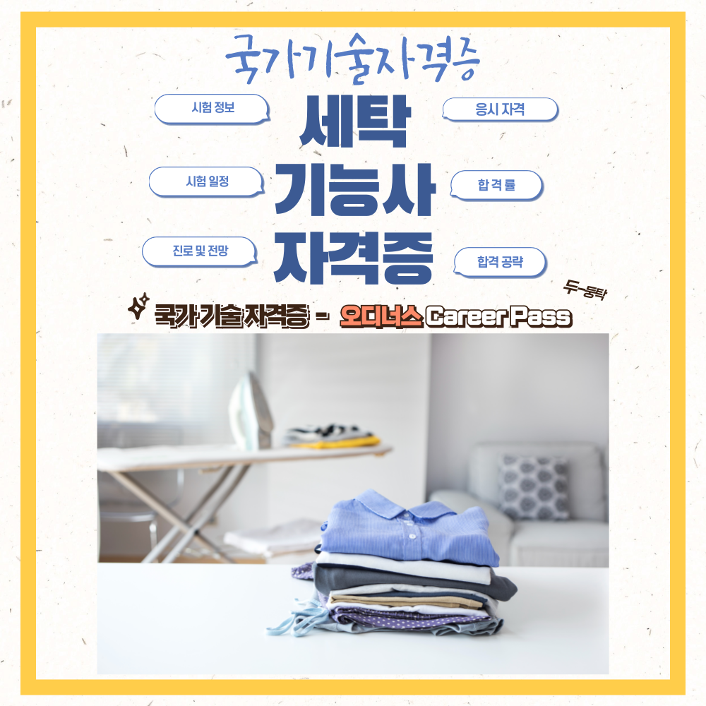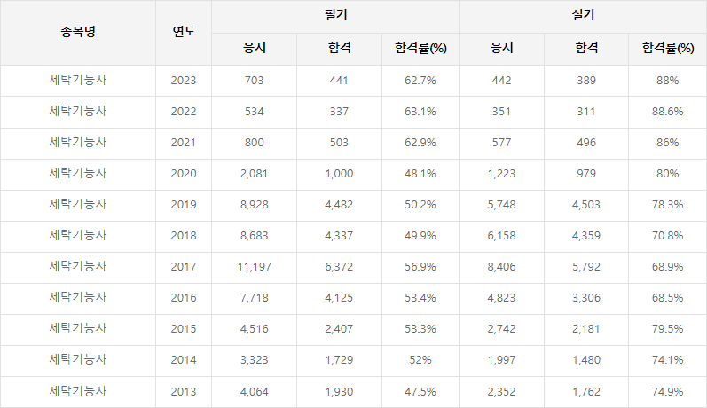 세탁기능사 자격시험은 세탁대상, 세탁방법, 세탁관리 3개의 과목으로 이루어져 있으며 총 60문항으로 이루어져 있습니다. 세탁기능사의 경우, 타 국가기술 자격과 비교했을 때 합격률이 상당히 높은 편입니다. 세탁기능사 합격률은 매년 필기시험의 경우 약 50%, 실기시험의 경우는 80% 정도로, 그만큼 난이도가 높지 않다고 말할 수 있습니다. 또한, 필기시험은 문제은행식으로 출제가 되기 때문에, 기출문제만 몇 번 풀어봐도 어렵지 않게 시험에 합격할 수 있습니다.