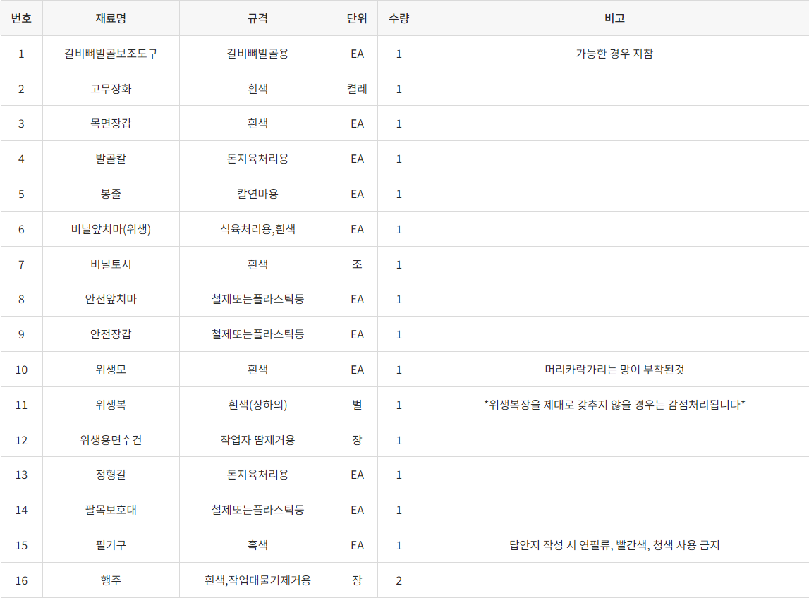 | 실기 | * 식육의 부위별 골발 및 정형작업 | * 작업형 (1시간 정도) | * 100점을 만점으로 60점 이상 |