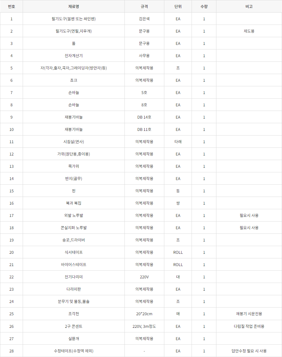2. 전기다리미, 다리미판, 북과 북집은 반드시 수험자가 지참해서 사용하여야 하며, 미지참 시 발생되는 불이익은 수험자 귀책사유이다. 또한, 전기다리미는 가정용 다리미를 준비하여야 하며, 공업용 다리미 준비 시 반드시 시험장에 물통걸이대가 있는지 확인하여야 한다.(시험장에 물통걸이대가 없는 경우에는 공업용 다리미는 사용할 수 없음) ※ 모든 작업은 안전에 준수하여야 하며, 기계 및 공구 사용 시에는 안전에 유의하여야 한다.