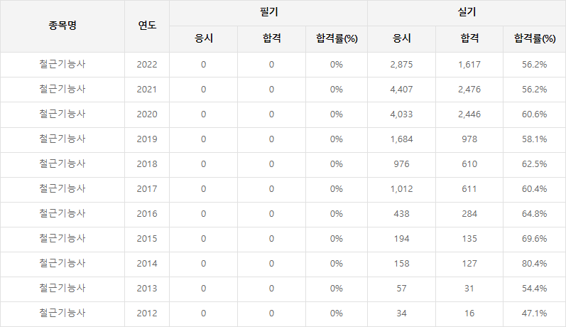 철근기능사 자격은 시공 건설과 관련된 자격증 중 하나로 건축구조물에 사용되는 철근과 관련된 기능 인력에 대한 자격입니다. 다른 시공 자격증들과 비슷한 시기인 1974년에 제정된 자격증으로 시공 분야에 반드시 필요한 필수 전문 인력이라고 할 수 있습니다. 현재에도 철근 콘크리트는 건축물을 지을 때 필수적으로 사용되는 구조물이기 때문에 이러한 구조물을 전문적으로 다루고 취급할 수 있는 전문 인력을 양성하기 위해 해당 자격이 제정되었다.