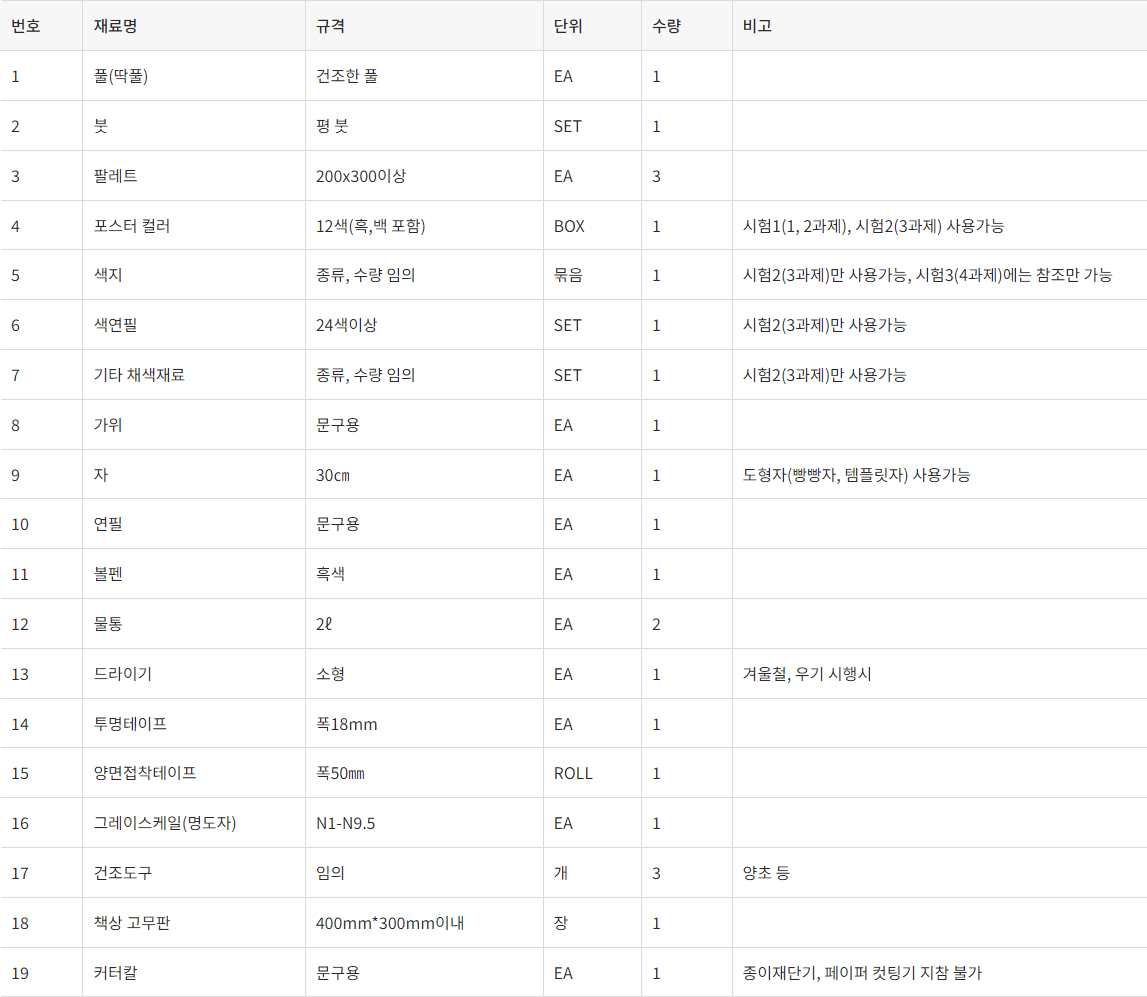 1. 지참불가 항목 : 참고서적, 한국표준색표집, 먼셀북(유사한 형태와 내용으로 되어있는 것), 시험에 단서가 되는 것,