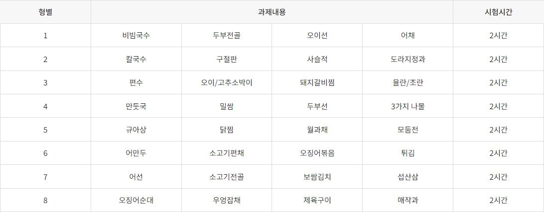 | 실기 | * 조리작업 | * 작업형 (2시간) | * 100점을 만점으로 60점 이상 |