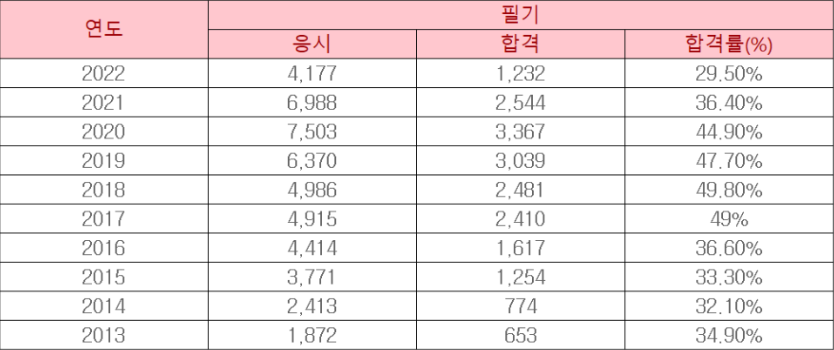 4지 택일형으로 과목당 20문항씩 총 80문항이고 시험 시간은 1시간 30분입니다. 필기시험의 경우 과목당 40점, 전체평균 60점 이상 맞으면 합격이기 때문에 과락을 면하지 않게 버리는 과목과 고득점이 필요한 과목을 설정하여 선택한 과목에 집중하는 게 중요합니다. 2022년부터 시험 출제 유형이 많이 변경되었지만 기본적으로 공부해야 될 내용은 비슷하기 때문에 기출문제 위주로 준비하는 것이 가장 도움이 됩니다.