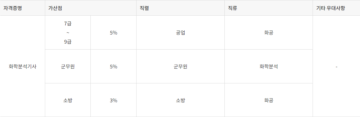 | 화학분석기사 | 수행업무 : 화학 관련 원재료나 완성품의 화학성분 분석을 위한 분석 계획 수립 관련분야 : 생산 및 품질관리, 제품 개발, 실험실 및 연구실 등 |