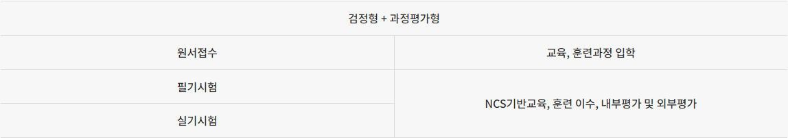 과정평가형 자격은 국가직무능력표준(NCS)을 기반으로 설계되어 지정된 교육, 훈련과정을 충실히 이수한 후 내부 및 외부의 평가를 통해 합격 기준을 충족시키는 훈련생에게 자격을 부여하는 제도입니다. 과정평가평 자격취득은 해당종목을 운영하는 교육훈련기관이 있어야 가능하며 검정 방식은 기존의 검정형과 과정평가형이 병행하여 운영되고 있습니다.