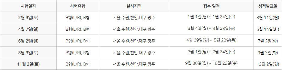 - 정기시험 (Periodical Test) : 일반인을 대상으로 실시하는 시험이며 정해진 일자 및 시험센터에서 시행됩니다.