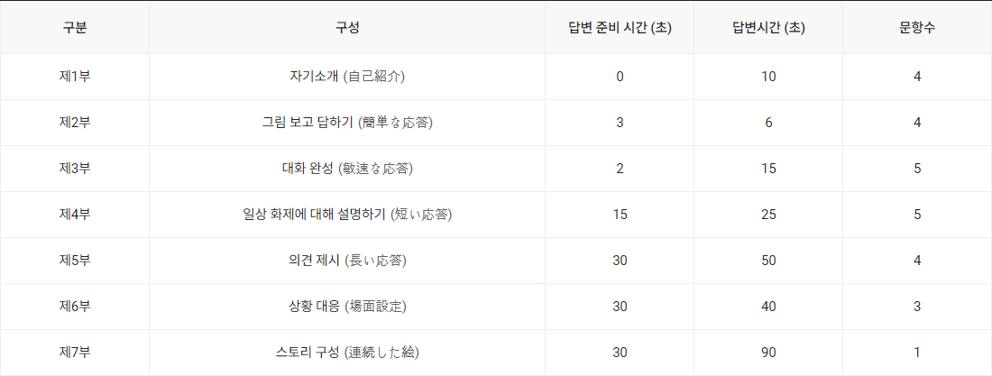 자기소개, 질의응답, 신속한 응답, 짧은 응답, 의견 제시, 장면 설정, 스토리 구성 등 다양한 형식과 구성으로 이루어진 인터뷰 형식의 평가방식 즉 일본어 말하기 입니다. 친숙한 삽화와 일상적 장면 및 상황 등을 소재로 하여 제시된 질문에 답하는 형식이며 수험자의 부담을 최소화하기 위하여 시험의 전반부는 쉬운 난이도로 시작됩니다. 시험에 적응하고 어느 정도 자신감을 가지면 후반부로 갈수록 서서히 난도는 높아집니다.